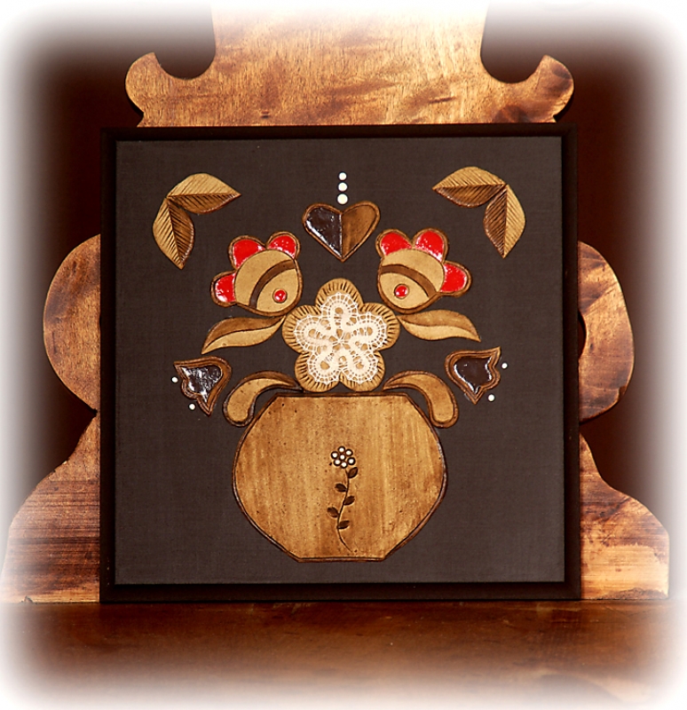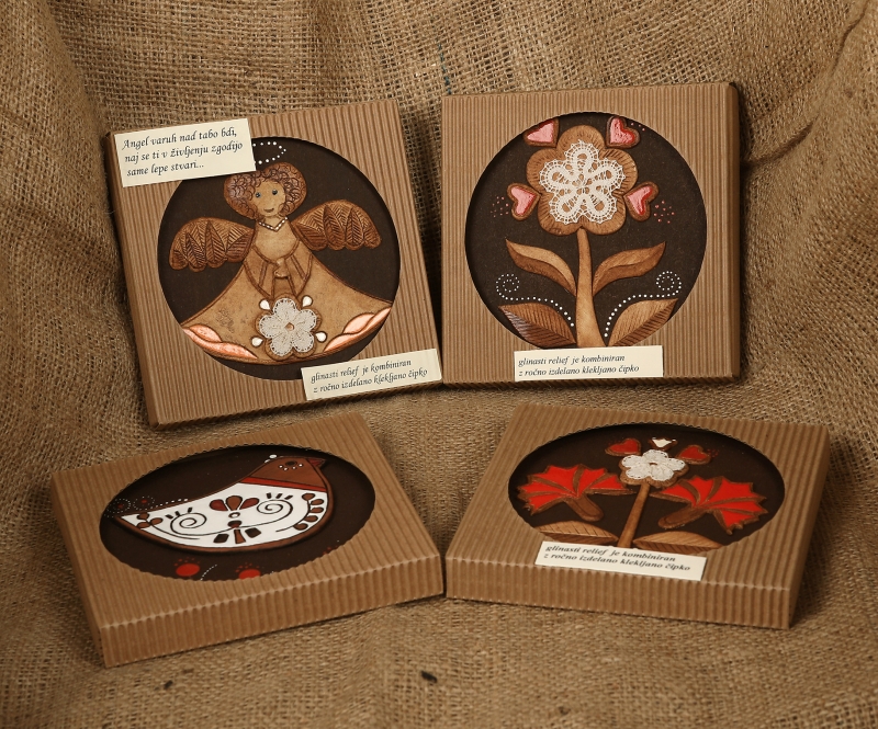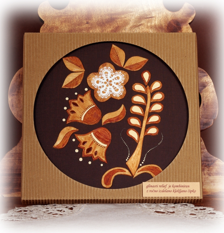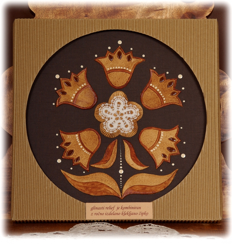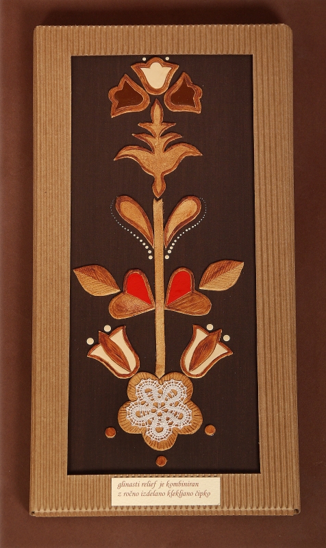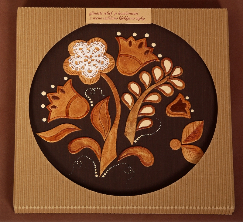 Glinasti reliefi aplicirani z ročno izdelano klekljano čipko